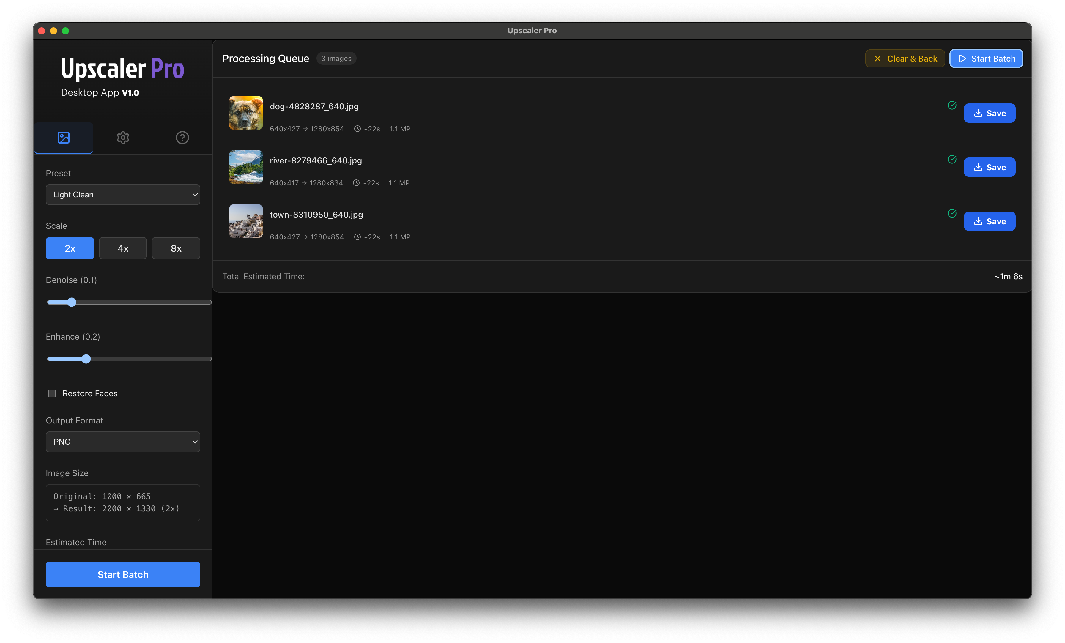 UpscalerPro brings professional AI upscaling directly to your desktop (Mac or PC). One purchase, lifetime access, zero recurring costs. Process images of any size entirely on your computer with complete privacy. No internet connection required after installation.